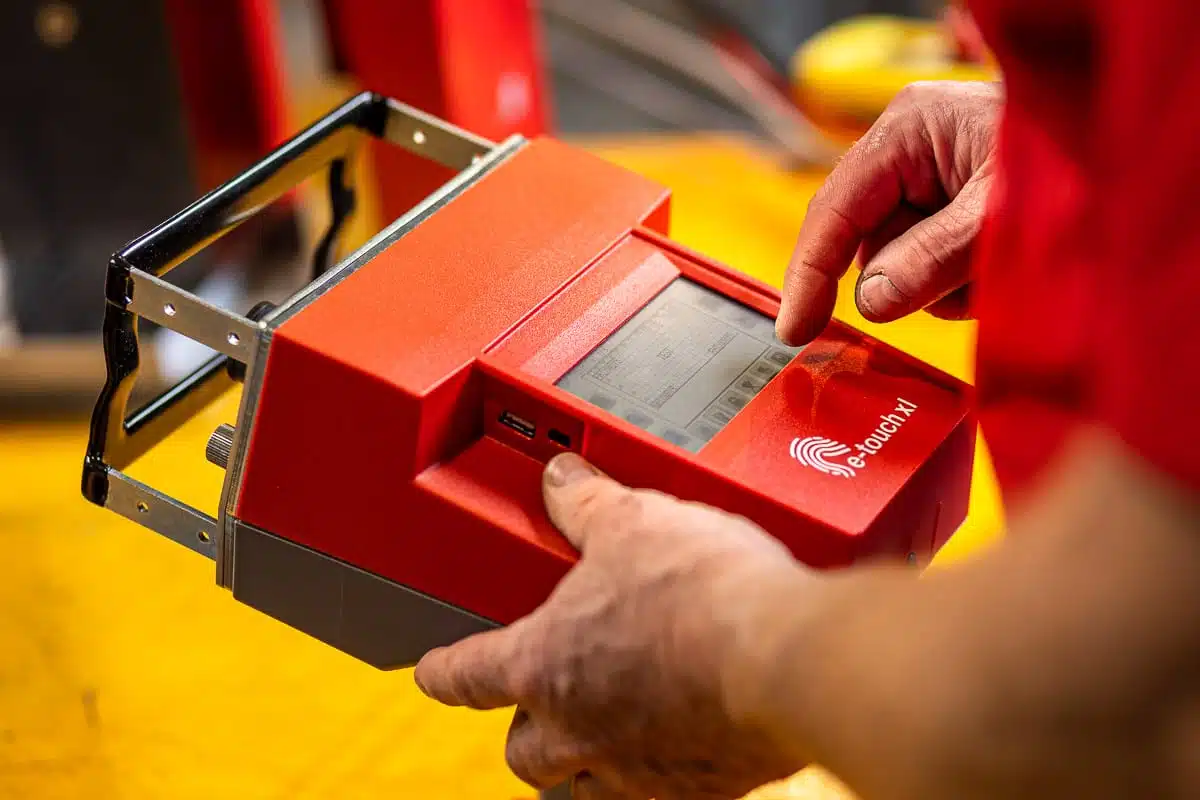 The E-TOUCH XL is a cordless portable touch screen marking machine with A VERY LARGE MARKING WINDOW: 120 x 50 mm.